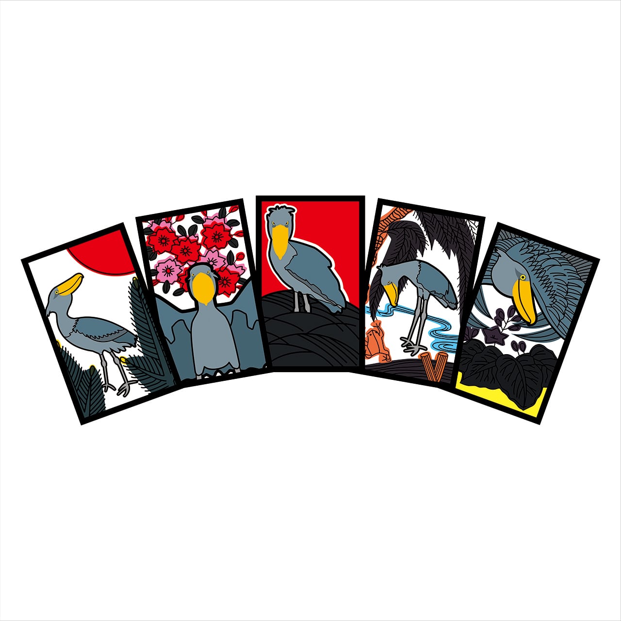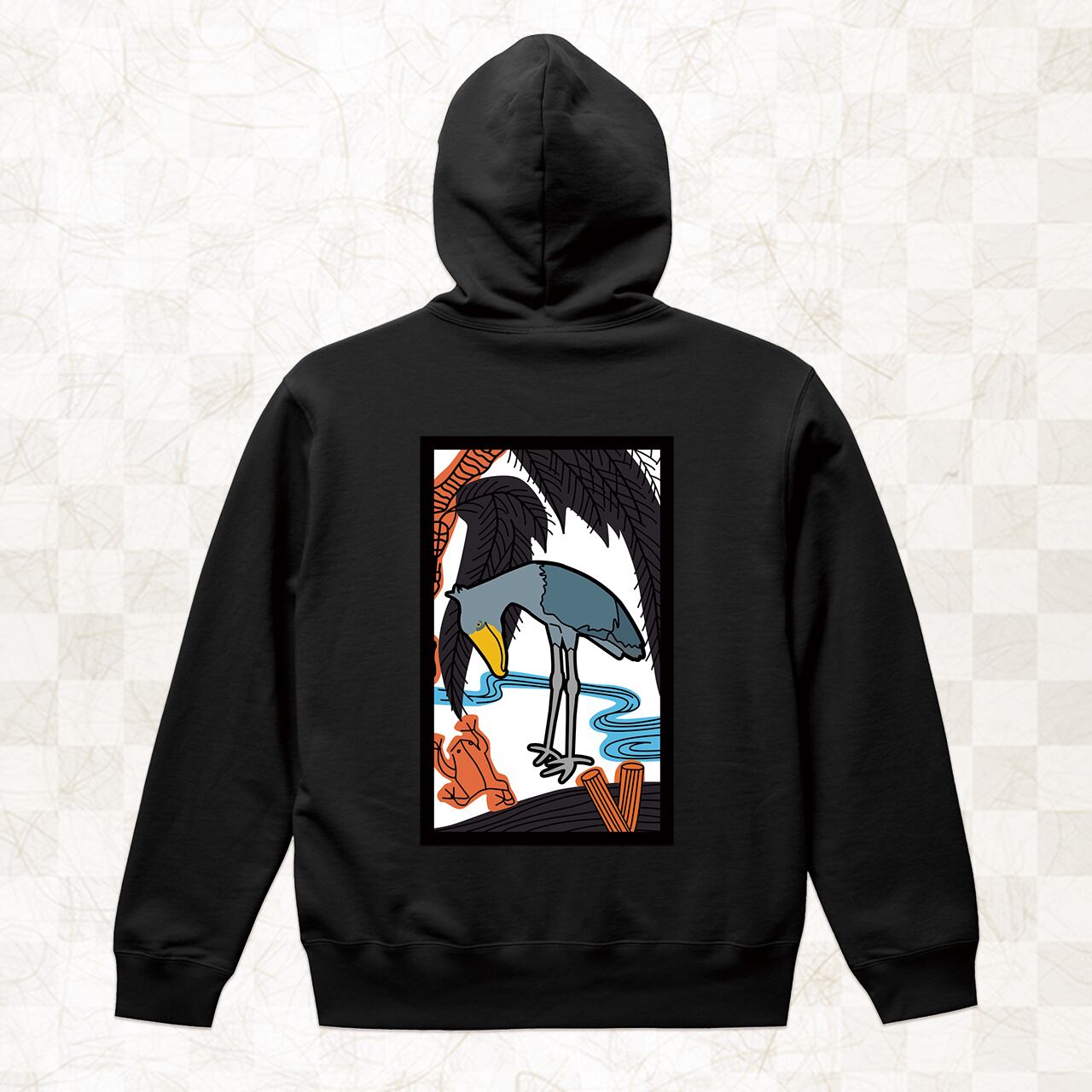 花札「柳に小野道風」のユーモラスな世界。雨の柳の下、蛙をじっと見つめるハシビロコウ。パーカーの背中で展開されるパロディデザインは、クスッと笑えること間違いなし。
