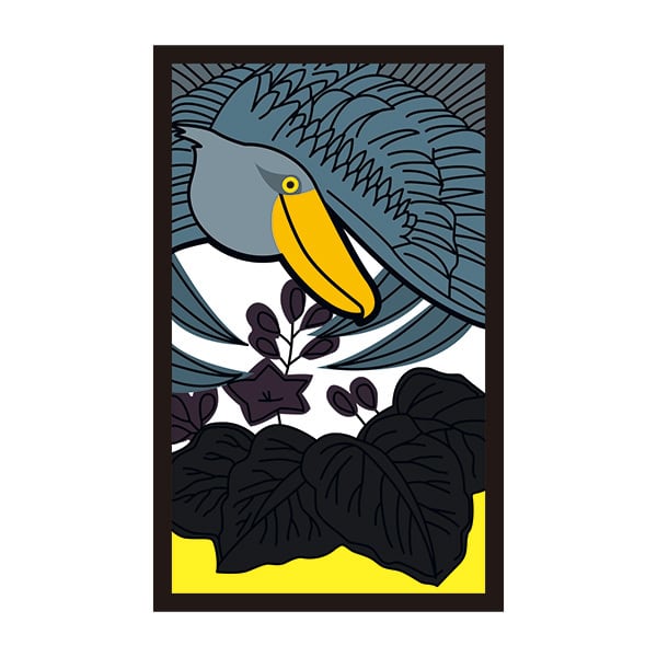 花札「桐に鳳凰」の荘厳な世界。桐の葉の海から姿を現したのは、威厳たっぷりのハシビロコウ。和の重厚さと、ハシビロコウの存在感がパーカーの背中に融合した、プレミアムな一着です。